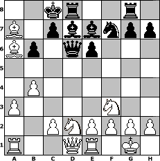 game notation in PGN-format [Event "F"] [Site "www.myChess.de"] [Date "2017.08.16"] [Round "1"] [White "wolni55"] [Black "Knight"] [ECO "C02"] [WhitemyELO "1387"] [BlackmyELO "1206"] [Result "1-0"] [TimeControl "10/2592000"] [WhiteDays "55"] [BlackDays "60"] [MyChessNo "109190"] 1. e4 e6 2. d4 d5 3. e5 Nc6 4. a3 f6 5. Nf3 Be7 6. Bd3 fxe5 7. dxe5 d4 8. O-O Qd5 9. Re1 Bd7 10. b4 O-O-O 11. Bb2 Nh6 12. Nbd2 Nxe5 13. Rxe5 Qd6 14. Bxd4 Nf7 15. Re1 Rhg8 16. Bxa7 b6 17. Ba6# 1-0 position notation in FEN-format 2kr2r1/B1pbbnpp/Bp1qp3/8/1P6/P4N2/2PNPPPP/R2QR1K1 - - - 1 17 Captured white pieces: Captured black pieces: Click on a captured piece in order to display the desired move!