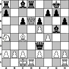 game notation in PGN-format [Event "2. Weihnachts-Open des Club Helvetia"] [Site "www.myChess.de"] [Date "2005.12.24"] [Round "1"] [White "Chelly"] [Black "bane"] [ECO "B23"] [WhitemyELO "1781"] [BlackmyELO "1817"] [Result "0-1"] [TimeControl "10/1728000"] [WhiteDays "19"] [BlackDays "20"] [MyChessNo "21068"] 1. e4 c5 2. Nc3 Nc6 3. Nf3 e6 4. d4 cxd4 5. Nxd4 Nf6 6. Bg5 d6 7. Qd2 Be7 8. O-O-O O-O 9. Bc4 h6 10. Bxf6 Bxf6 11. Nxc6 bxc6 12. Qxd6 Qb6 13. e5 Rd8 14. Na4 Bg5+ 15. f4 Qe3+ 0-1 position notation in FEN-format r1br2k1/p4pp1/2pQp2p/4P1b1/N1B2P2/4q3/PPP1P1PP/2KR3R - - - 1 16 Captured white pieces: Captured black pieces: Click on a captured piece in order to display the desired move!