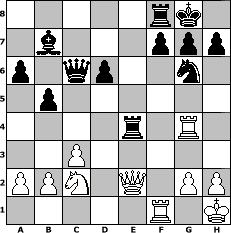 game notation in PGN-format [Event "Sweschnikow II"] [Site "www.myChess.de"] [Date "2012.04.28"] [Round "1"] [White "reisinger"] [Black "Joschi"] [ECO "B33"] [WhitemyELO "1454"] [BlackmyELO "1651"] [Result "0-1"] [TimeControl "10/1728000"] [WhiteDays "20"] [BlackDays "20"] [MyChessNo "81287"] 1. e4 c5 2. Nf3 Nc6 3. d4 cxd4 4. Nxd4 Nf6 5. Nc3 e5 6. Ndb5 d6 7. Bg5 a6 8. Na3 b5 9. Nd5 Be7 10. Bd3 Nxd5 11. Bxe7 Ndxe7 12. c3 O-O 13. O-O Bb7 14. Qc2 Qb6 15. Kh1 Rad8 16. f4 exf4 17. Rxf4 Ne5 18. Raf1 Nxd3 19. Qxd3 Ng6 20. Rf5 Ne5 21. Qe2 Qc6 22. R5f4 Ng6 23. Rg4 Rde8 24. Nc2 Rxe4 0-1 position notation in FEN-format 5rk1/1b3ppp/p1qp2n1/1p6/4r1R1/2P5/PPN1Q1PP/5R1K - - - 0 25 Captured white pieces: Captured black pieces: Click on a captured piece in order to display the desired move!