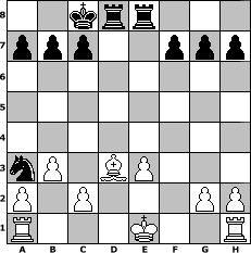 game notation in PGN-format [Event "2.No-Engine-Schachturnier"] [Site "www.myChess.de"] [Date "2013.08.15"] [Round "1"] [White "paul"] [Black "Haki"] [ECO "B01"] [WhitemyELO "1323"] [BlackmyELO "1364"] [Result "1-0"] [TimeControl "10/1728000"] [WhiteDays "08"] [BlackDays "00"] [MyChessNo "89780"] 1. e4 d5 2. exd5 Qxd5 3. Nf3 Bg4 4. d4 e5 5. Be2 Nc6 6. dxe5 Qxd1+ 7. Bxd1 O-O-O 8. Nc3 Bb4 9. Bd2 Nge7 10. Bg5 Bxf3 11. Bxf3 Nxe5 12. Bxe7 Bxe7 13. Be4 Nc4 14. Nd5 Bc5 15. b3 Na3 16. Ne3 Bxe3 17. fxe3 Rhe8 18. Bd3 1-0 position notation in FEN-format 2krr3/ppp2ppp/8/8/8/nP1BP3/P1P3PP/R3K2R - KQ - 2 18 Captured white pieces: Captured black pieces: Click on a captured piece in order to display the desired move!