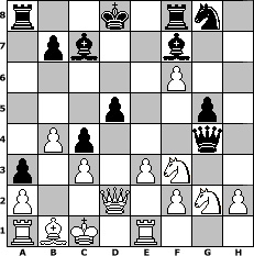 game notation in PGN-format [Event "1. Chess960/6"] [Site "www.myChess.de"] [Date "2007.03.01"] [Round "1"] [White "Morus@"] [Black "Offi@ (adv.)"] [Variant "Fischerrandom"] [SetUp "1"] [FEN "rbqkbrnn/pppppppp/8/8/8/8/PPPPPPPP/RBQKBRNN w KQkq - 0 1"] [WhitemyELO "1500"] [BlackmyELO "1500"] [Result "0-1"] [TimeControl "10/3456000"] [WhiteDays "069"] [BlackDays "115"] [MyChessNo "33158"] 1. d4 c5 2. Bc3 c4 3. Nf3 Ng6 4. e3 Nf6 5. Ng3 d5 6. Qd2 h5 7. Ne2 Ne4 8. Qe1 Qg4 9. Rg1 Bd6 10. Kc1 Nxc3 11. Qxc3 Qd7 12. Qa5+ Bc7 13. Qb4 f6 14. Re1 a5 15. Qd2 a4 16. c3 a3 17. b4 Bf7 18. Ng3 h4 19. Nf5 e6 20. N5xh4 Ne7 21. g4 g5 22. Ng2 e5 23. dxe5 Qxg4 24. exf6 Ng8 0-1 position notation in FEN-format r2k1rn1/1pb2b2/5P2/3p2p1/1Pp3q1/p1P1PN2/P2Q1PNP/RBK1R3 - kq - 1 25 Captured white pieces: Captured black pieces: Click on a captured piece in order to display the desired move!