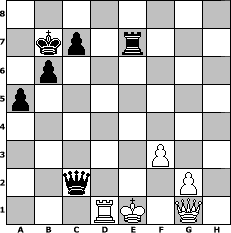 game notation in PGN-format [Event "Ja, is denn heut scho Weihnachten?"] [Site "www.myChess.de"] [Date "2014.12.06"] [Round "1"] [White "Mattheus"] [Black "Schefsche"] [ECO "C21"] [WhitemyELO "1295"] [BlackmyELO "1378"] [Result "0-1"] [TimeControl "10/2592000"] [WhiteDays "145"] [BlackDays "147"] [MyChessNo "97072"] 1. e4 e5 2. d4 d5 3. dxe5 d4 4. Nf3 Bg4 5. Bd3 a6 6. O-O Nc6 7. Bg5 Be7 8. Bxe7 Qxe7 9. Re1 O-O-O 10. Nbd2 Nxe5 11. Qe2 Nf6 12. a4 h5 13. h3 Bxf3 14. Nxf3 Nxf3+ 15. Qxf3 g5 16. e5 Nd5 17. Bc4 g4 18. hxg4 hxg4 19. Qxg4+ Kb8 20. e6 f6 21. Qf5 Qd6 22. Bxd5 Qh2+ 23. Kf1 Qd6 24. Bf3 Qe7 25. b4 Qxb4 26. Rab1 Qc4+ 27. Kg1 b6 28. Qxf6 Qxa4 29. e7 Rde8 30. Bc6 Qxc2 31. Qxd4 Qxc6 32. Rec1 Qh6 33. Kf1 Rxe7 34. f3 a5 35. Rc6 Qxc6 36. Qxh8+ Kb7 37. Qd4 Rh7 38. Qg1 Qc4+ 39. Ke1 Qc2 40. Rd1 Re7+ 0-1 position notation in FEN-format 8/1kp1r3/1p6/p7/8/5P2/2q3P1/3RK1Q1 - - - 9 41 Captured white pieces: ![]() ![]() ![]() ![]() ![]() ![]() ![]() ![]() ![]() ![]() ![]() ![]() ![]() ![]() ![]() Captured black pieces: ![]() ![]() ![]() ![]() ![]() ![]() ![]() ![]() ![]() ![]() ![]() ![]() ![]() ![]() ![]() Click on a captured piece in order to display the desired move!