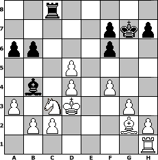 game notation in PGN-format [Event "Schachmatt unter Palmen"] [Site "www.myChess.de"] [Date "2009.07.13"] [Round "1"] [White "rgHD"] [Black "Schmalte"] [ECO "A20"] [WhitemyELO "1528"] [BlackmyELO "1475"] [Result "1-0"] [TimeControl "10/864000"] [WhiteDays "09"] [BlackDays "00"] [MyChessNo "57405"] 1. c4 e5 2. g3 c6 3. Bg2 d5 4. cxd5 cxd5 5. d4 e4 6. Nc3 Nf6 7. Bg5 Be6 8. Qb3 b6 9. Bxf6 gxf6 10. Qb5+ Qd7 11. Rc1 Nc6 12. Nxe4 Bb4+ 13. Kf1 Be7 14. Qxc6 Rc8 15. Qxc8+ Qxc8 16. Rxc8+ Bxc8 17. Nc3 Be6 18. e3 O-O 19. Bxd5 Rc8 20. Nge2 Bh3+ 21. Bg2 Bf5 22. Nf4 Bb4 23. Nfd5 Bd6 24. e4 Be6 25. Ke2 Kg7 26. f4 Bxd5 27. exd5 Bb4 28. Kd3 a6 29. a3 1-0 position notation in FEN-format 2r5/5pkp/pp3p2/3P4/1b1P1P2/P1NK2P1/1PP3BP/7R - - - 0 29 Captured white pieces: ![]() ![]() ![]() ![]() ![]() ![]() ![]() ![]() ![]() ![]() ![]() ![]() ![]() ![]() ![]() Captured black pieces: ![]() ![]() ![]() ![]() ![]() ![]() ![]() ![]() ![]() ![]() ![]() ![]() ![]() ![]() ![]() Click on a captured piece in order to display the desired move!