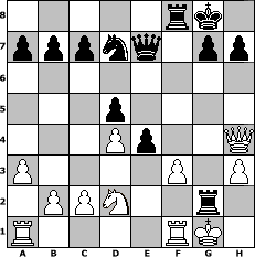 game notation in PGN-format [Event "Scottish Open"] [Site "www.myChess.de"] [Date "2007.10.22"] [Round "1"] [White "Andylein1989"] [Black "nogumo"] [ECO "C42"] [WhitemyELO "1462"] [BlackmyELO "1622"] [Result "0-1"] [TimeControl "10/864000"] [WhiteDays "29"] [BlackDays "30"] [MyChessNo "39167"] 1. e4 e5 2. Nf3 Nf6 3. Nc3 Bb4 4. d3 Nc6 5. Bd2 d6 6. h3 O-O 7. a3 Bxc3 8. Bxc3 Be6 9. Be2 Nd7 10. O-O f5 11. exf5 Bxf5 12. d4 e4 13. Nd2 d5 14. Bg4 Ne7 15. Bb4 Rf7 16. Bxe7 Qxe7 17. Bxf5 Rxf5 18. Qg4 Raf8 19. f3 Rg5 20. Qh4 Rxg2+ 0-1 position notation in FEN-format 5rk1/pppnq1pp/8/3p4/3Pp2Q/P4P1P/1PPN2r1/R4RK1 - - - 0 21 Captured white pieces: Captured black pieces: Click on a captured piece in order to display the desired move!