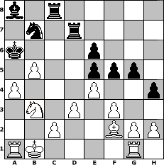 game notation in PGN-format [Event "Chess960 Open I 2014"] [Site "www.myChess.de"] [Date "2014.01.07"] [Round "1"] [White "SibylleSchwerdt"] [Black "Achimkogge"] [Variant "Fischerrandom"] [SetUp "1"] [FEN "rkqbbnrn/pppppppp/8/8/8/8/PPPPPPPP/RKQBBNRN w KQkq - 0 1"] [WhitemyELO "1518"] [BlackmyELO "1398"] [Result "1-0"] [TimeControl "10/3456000"] [WhiteDays "40"] [BlackDays "40"] [MyChessNo "92192"] 1. e4 e5 2. Bg4 g6 3. f3 h5 4. Bh3 Bg5 5. Qd1 c5 6. Qe2 Qc6 7. Bf2 O-O-O 8. Qc4 Ne6 9. Bxe6 dxe6 10. Qxc5 Qxc5 11. Bxc5 Kb8 12. Nf2 b6 13. Bb4 a5 14. Bc3 f6 15. a4 Nf7 16. d3 Bc6 17. Nd1 h4 18. Nfe3 Bxe3 19. Nxe3 Nh6 20. Nc4 Kb7 21. Be1 g5 22. Bf2 Nf7 23. Bxb6 Rd7 24. Bf2 Ka6 25. Be1 Nd6 26. Nxa5 Ba8 27. b4 Rc8 28. Nb3 f5 29. Bf2 Nb7 30. b5# 1-0 position notation in FEN-format b1r5/1n1r4/k3p3/1P2ppp1/P3P2p/1N1P1P2/2P2BPP/RK4R1 - KQ - 0 30 Captured white pieces: Captured black pieces: Click on a captured piece in order to display the desired move!