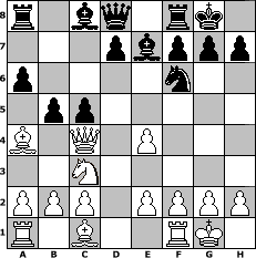 game notation in PGN-format [Event "Pfingst -Turnier"] [Site "www.myChess.de"] [Date "2009.05.30"] [Round "2"] [White "Steppenwolf"] [Black "Ostseeboy"] [ECO "C65"] [WhitemyELO "1217"] [BlackmyELO "1261"] [Result "0-1"] [TimeControl "10/2592000"] [WhiteDays "39"] [BlackDays "60"] [MyChessNo "56171"] 1. e4 e5 2. Nf3 Nc6 3. Bb5 Nf6 4. Nc3 Be7 5. O-O O-O 6. d4 exd4 7. Nxd4 Nxd4 8. Qxd4 c5 9. Qc4 a6 10. Ba4 b5 0-1 position notation in FEN-format r1bq1rk1/3pbppp/p4n2/1pp5/B1Q1P3/2N5/PPP1PPPP/R1B2RK1 - - - 0 11 Captured white pieces: ![]() ![]() ![]() ![]() ![]() ![]() ![]() ![]() ![]() ![]() ![]() ![]() ![]() ![]() ![]() Captured black pieces: ![]() ![]() ![]() ![]() ![]() ![]() ![]() ![]() ![]() ![]() ![]() ![]() ![]() ![]() ![]() Click on a captured piece in order to display the desired move!