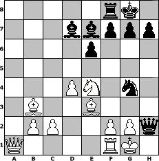 game notation in PGN-format [Event "unter uns Nr. 17"] [Site "www.myChess.de"] [Date "2014.02.13"] [Round "1"] [White "beowulf"] [Black "Wulfen49"] [ECO "A15"] [WhitemyELO "1350"] [BlackmyELO "1223"] [Result "0-1"] [TimeControl "10/864000"] [WhiteDays "30"] [BlackDays "29"] [MyChessNo "92917"] 1. c4 Nf6 2. d4 d5 3. Nf3 e6 4. a3 c5 5. e3 Nc6 6. cxd5 Qxd5 7. Nc3 Qd6 8. Bb5 Bd7 9. O-O a6 10. Bc4 cxd4 11. Nxd4 Nxd4 12. exd4 b5 13. Bb3 Be7 14. Be3 O-O 15. Rc1 b4 16. axb4 a5 17. bxa5 Rxa5 18. Ra1 Rxa1 19. Qxa1 Ng4 20. Ne4 Qxh2# 0-1 position notation in FEN-format 5rk1/3bbppp/4p3/8/3PN1n1/1B2B3/1PP2PPq/Q4RK1 - - - 0 21 Captured white pieces: Captured black pieces: Click on a captured piece in order to display the desired move!