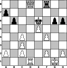 game notation in PGN-format [Event "Endlich Fr"] [Site "www.myChess.de"] [Date "2014.03.25"] [Round "1"] [White "Macks"] [Black "borsti"] [ECO "A21"] [WhitemyELO "1426"] [BlackmyELO "1217"] [Result "1-0"] [TimeControl "10/1728000"] [WhiteDays "60"] [BlackDays "60"] [MyChessNo "93597"] 1. c4 e5 2. Nc3 Bb4 3. Nf3 d6 4. g3 Bxc3 5. bxc3 Bg4 6. Bg2 Bxf3 7. Bxf3 c6 8. d4 Nd7 9. O-O h6 10. Ba3 Ndf6 11. Qb3 b6 12. Bxc6+ Nd7 13. Bxa8 Qxa8 14. Bxd6 Ngf6 15. dxe5 Ne4 16. Rad1 Qc6 17. Qa3 Nxd6 18. Qxd6 Qxd6 19. exd6 O-O 20. Rfe1 f5 21. e4 f4 22. e5 Nc5 23. d7 Ne6 24. gxf4 g6 25. Rd6 Kf7 26. Red1 Ke7 27. Rxe6+ Kxe6 28. d8=Q 1-0 position notation in FEN-format 3Q1r2/p7/1p2k1pp/4P3/2P2P2/2P5/P1P2P1P/3R2K1 - - - 0 28 Captured white pieces: Captured black pieces: Click on a captured piece in order to display the desired move!