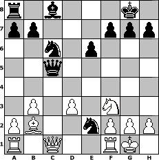 game notation in PGN-format [Event "Make myChess great again...."] [Site "www.myChess.de"] [Date "2017.02.11"] [Round "1"] [White "Joschi"] [Black "sprinterde"] [ECO "B32"] [WhitemyELO "1561"] [BlackmyELO "1729"] [Result "0-1"] [TimeControl "10/864000"] [WhiteDays "20"] [BlackDays "20"] [MyChessNo "106891"] 1. e4 c5 2. Nf3 Nc6 3. d4 e6 4. Be2 Qb6 5. dxc5 Bxc5 6. O-O Nge7 7. Nc3 O-O 8. Na4 Qa5 9. Nxc5 Qxc5 10. b3 d5 11. exd5 Nxd5 12. Bb2 Rd8 13. Qc1 Nc3 14. Bd3 Rxd3 15. cxd3 Ne2+ 0-1 position notation in FEN-format r1b3k1/pp3ppp/2n1p3/2q5/8/1P1P1N2/PB2nPPP/R1Q2RK1 - - - 1 16 Captured white pieces: Captured black pieces: Click on a captured piece in order to display the desired move!