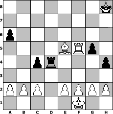 game notation in PGN-format [Event "1.Schaltjahresturnier@mySchach"] [Site "www.myChess.de"] [Date "2004.02.29"] [Round "2"] [White "Wormatia08"] [Black "Master1"] [ECO "C65"] [WhitemyELO "1595"] [BlackmyELO "1165"] [Result "1-0"] [TimeControl "10/1728000"] [WhiteDays "80"] [BlackDays "80"] [MyChessNo "2688"] 1. e4 e5 2. Nf3 Nc6 3. Bb5 Nf6 4. Nc3 a6 5. Ba4 d5 6. exd5 Nxd5 7. Bxc6+ bxc6 8. O-O Bd6 9. d4 exd4 10. Nxd4 Bb7 11. Re1+ Be7 12. Nxd5 cxd5 13. Nf5 O-O 14. Nxe7+ Kh8 15. Qh5 g6 16. Qe5+ f6 17. Qe6 Bc8 18. Nxc8 Qxc8 19. Qe7 Qe8 20. Qxe8 Raxe8 21. Rxe8 Rxe8 22. Bf4 c5 23. Kf1 g5 24. Bd6 c4 25. Rd1 h5 26. Rxd5 h4 27. Rc5 Re4 28. Ra5 f5 29. Rxf5 Rd4 30. Be5+ 1-0 position notation in FEN-format 7k/8/p7/4BRp1/2pr3p/8/PPP1PPPP/5K2 - - - 2 30 Captured white pieces: Captured black pieces: Click on a captured piece in order to display the desired move!