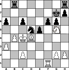 game notation in PGN-format [Event "fr"] [Site "www.myChess.de"] [Date "2011.10.14"] [Round "1"] [White "kari6katz"] [Black "martinus"] [ECO "B31"] [WhitemyELO "1784"] [BlackmyELO "1751"] [Result "0-1"] [TimeControl "10/1728000"] [WhiteDays "20"] [BlackDays "20"] [MyChessNo "76827"] 1. e4 c5 2. Nf3 Nc6 3. Bb5 g6 4. Nc3 Bg7 5. O-O Nf6 6. e5 Ng4 7. Bxc6 bxc6 8. Re1 Qc7 9. d4 cxd4 10. Qxd4 d6 11. exd6 Bxd4 12. dxc7 Bxf2+ 13. Kf1 Ba6+ 14. Ne2 Bxe1 15. Kxe1 Nf6 16. Bf4 Bxe2 17. Kxe2 Nd5 18. Be5 f6 19. Bd4 Nxc7 20. Kd3 Rd8 21. Kc4 a6 22. Re1 Kf7 23. b4 Nd5 24. Rf1 Kg7 25. Ng5 Rb8 26. a3 e5 0-1 position notation in FEN-format 1r5r/6kp/p1p2pp1/3np1N1/1PKB4/P7/2P3PP/5R2 - - - 0 27 Captured white pieces: Captured black pieces: Click on a captured piece in order to display the desired move!