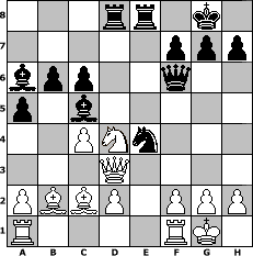 game notation in PGN-format [Event "Mal wieder spielen 2"] [Site "www.myChess.de"] [Date "2013.05.12"] [Round "1"] [White "Steffi"] [Black "lmilde1 (adv.)"] [ECO "C48"] [WhitemyELO "1534"] [BlackmyELO "1507"] [Result "0-1"] [TimeControl "10/1728000"] [WhiteDays "02"] [BlackDays "28"] [MyChessNo "88255"] 1. e4 e5 2. Nf3 Nc6 3. Nc3 Nf6 4. Bb5 Nd4 5. Nxd4 exd4 6. Ne2 Nxe4 7. Nxd4 Bc5 8. Qe2 O-O 9. O-O Re8 10. Qd3 c6 11. Ba4 d5 12. c3 Qf6 13. Bc2 a5 14. b3 b6 15. Bb2 Ba6 16. c4 dxc4 17. bxc4 Rad8 0-1 position notation in FEN-format 3rr1k1/5ppp/bpp2q2/p1b5/2PNn3/3Q4/PBBP1PPP/R4RK1 - - - 1 18 Captured white pieces: Captured black pieces: Click on a captured piece in order to display the desired move!