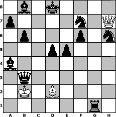 game notation in PGN-format [Event "960er Sommer Turnier"] [Site "www.myChess.de"] [Date "2006.05.20"] [Round "2"] [White "stierdame1965"] [Black "AG666"] [Variant "Fischerrandom"] [SetUp "1"] [FEN "qbrkbrnn/pppppppp/8/8/8/8/PPPPPPPP/QBRKBRNN w KQkq - 0 1"] [WhitemyELO "992"] [BlackmyELO "1494"] [Result "0-1"] [TimeControl "10/864000"] [WhiteDays "10"] [BlackDays "10"] [MyChessNo "25606"] 1. d4 b6 2. Bb4 Qd5 3. c4 Qxd4+ 4. Bd3 c5 5. Bc3 Qg4 6. f3 Qxg2 7. Nh3 f6 8. Kd2 Qxh3 9. Nf2 Qh6+ 10. Kd1 Qxh2 11. Ng4 Qh3 12. e4 e5 13. Nf2 Qg3 14. b4 Qxf3+ 15. Be2 Qg2 16. Nd3 Nh6 17. Rf2 Qxe4 18. Qb1 Qxc4 19. Nb2 Qd5+ 20. Qd3 Qh1+ 21. Rf1 Qh4 22. Be1 Qg5 23. Nc4 N8f7 24. Qxh7 d5 25. Bd2 Qg2 26. Bf3 Qxf1+ 27. Kc2 Qxc4+ 28. Kd1 Qf1+ 29. Kc2 Qxf3 30. Qxg7 Rg8 31. Qh7 cxb4+ 32. Kb1 Rxc1+ 33. Kxc1 Rg1+ 34. Kc2 Ba4+ 35. Kb2 b3 36. axb3 Qxb3# 0-1 position notation in FEN-format 1b1k4/p4n1Q/1p3p1n/3pp3/b7/1q6/1K1B4/6r1 - - - 0 37 Captured white pieces: Captured black pieces: Click on a captured piece in order to display the desired move!