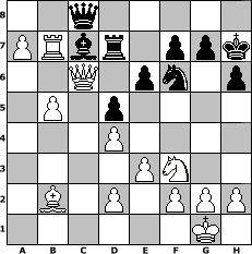 game notation in PGN-format [Event "Human Brain Turnier 2014"] [Site "www.myChess.de"] [Date "2014.06.12"] [Round "1"] [White "FrankB"] [Black "Caligula"] [ECO "D05"] [WhitemyELO "1653"] [BlackmyELO "1478"] [Result "1-0"] [TimeControl "10/2592000"] [WhiteDays "116"] [BlackDays "115"] [MyChessNo "94790"] 1. d4 d5 2. Nf3 Nf6 3. e3 e6 4. a3 a6 5. c4 b6 6. Nc3 c6 7. b4 b5 8. cxd5 cxd5 9. Bd3 Nc6 10. Bb2 Be7 11. O-O O-O 12. Rc1 Re8 13. Nxb5 axb5 14. Rxc6 Bd7 15. Rc3 Rc8 16. Qe2 Rxc3 17. Bxc3 Bd6 18. Bxb5 Bxb5 19. Qxb5 h6 20. Bb2 Kh8 21. Rc1 Ne4 22. a4 Nf6 23. Rc6 Qd7 24. Rb6 Qd8 25. a5 Bc7 26. Rb7 Re7 27. Qc6 Rd7 28. a6 Kh7 29. a7 Qc8 30. b5 1-0 position notation in FEN-format 2q5/PRbr1ppk/2Q1pn1p/1P1p4/3P4/4PN2/1B1P1PPP/6K1 - - - 0 30 Captured white pieces: Captured black pieces: Click on a captured piece in order to display the desired move!