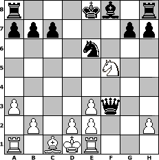 game notation in PGN-format [Event "Vor dem Urlaub noch ein schnelles Turnier!"] [Site "www.myChess.de"] [Date "2012.06.16"] [Round "1"] [White "Winston"] [Black "ElisabethPeters"] [ECO "C44"] [WhitemyELO "1489"] [BlackmyELO "1572"] [Result "0-1"] [TimeControl "10/864000"] [WhiteDays "10"] [BlackDays "10"] [MyChessNo "82267"] 1. e4 e5 2. Nf3 Nc6 3. a3 Nf6 4. Nc3 d5 5. exd5 Nxd5 6. Ne4 f5 7. Ng3 e4 8. Bc4 exf3 9. Qxf3 Nd4 10. Qd3 Nf4 11. Qe3+ Be6 12. Bxe6 Nxc2+ 13. Kd1 Nxe3+ 14. fxe3 Nxe6 15. Nxf5 Qd5 16. Rf1 Qxg2 17. Re1 Qf3+ 0-1 position notation in FEN-format r3kb1r/ppp3pp/4n3/5N2/8/P3Pq2/1P1PP2P/R1BKR3 - kq - 2 18 Captured white pieces: Captured black pieces: Click on a captured piece in order to display the desired move!