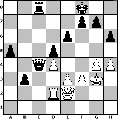 game notation in PGN-format [Event "R"] [Site "www.myChess.de"] [Date "2010.08.26"] [Round "1"] [White "Seneca"] [Black "Naunhofer"] [ECO "E00"] [WhitemyELO "1518"] [BlackmyELO "1542"] [Result "0-1"] [TimeControl "10/864000"] [WhiteDays "24"] [BlackDays "39"] [MyChessNo "67875"] 1. d4 Nf6 2. c4 e6 3. e3 d5 4. Nf3 c6 5. Be2 Nbd7 6. O-O Be7 7. b3 O-O 8. Nc3 b6 9. a4 Bb4 10. Bd2 Qe7 11. cxd5 cxd5 12. Bd3 Bb7 13. Nb5 Rfc8 14. h3 a6 15. Bxb4 Qxb4 16. Na3 Rc3 17. Bc2 Rac8 18. Ne5 h6 19. Nxd7 Nxd7 20. Qd2 Qd6 21. Rfc1 Kf8 22. Nb1 R3c7 23. Ra2 a5 24. Rd1 Ba6 25. g3 Nf6 26. Bd3 Bxd3 27. Qxd3 Ne4 28. Kg2 Qb4 29. f3 Nc3 30. Nxc3 Rxc3 31. Qe2 Qxb3 32. Rb2 Qxa4 33. Rdd2 b5 34. h4 b4 35. Kh3 b3 36. g4 Rc2 37. Kg3 Rxd2 38. Rxd2 Qc4 0-1 position notation in FEN-format 2r2k2/5pp1/4p2p/p2p4/2qP2PP/1p2PPK1/3RQ3/8 - - - 1 39 Captured white pieces: Captured black pieces: Click on a captured piece in order to display the desired move!