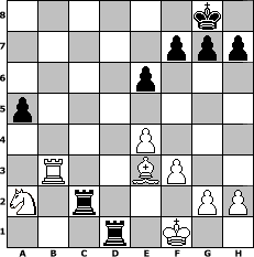 game notation in PGN-format [Event "Trauerspiel :-)"] [Site "www.myChess.de"] [Date "2008.09.20"] [Round "1"] [White "Naunhofer"] [Black "thw"] [ECO "A40"] [WhitemyELO "1637"] [BlackmyELO "1521"] [Result "0-1"] [TimeControl "10/864000"] [WhiteDays "10"] [BlackDays "10"] [MyChessNo "48108"] 1. d4 e6 2. c4 d5 3. Nc3 Nf6 4. Nf3 c5 5. dxc5 Bxc5 6. cxd5 Nxd5 7. e3 Qa5 8. Bb5+ Bd7 9. Qa4 Bb4 10. Bd2 Qxa4 11. Bxa4 Bxc3 12. Bxd7+ Nxd7 13. bxc3 Rc8 14. Nd4 O-O 15. Ne2 Ne5 16. O-O Nd3 17. Rfb1 b6 18. Rb3 Rc4 19. Nc1 Nc5 20. Ra3 Ne4 21. Be1 Ra8 22. Ne2 a5 23. f3 Nc5 24. e4 Ne3 25. Rc1 Nd3 26. Bf2 Nxc1 27. Nxc1 Nc2 28. Rb3 b5 29. Kf1 b4 30. cxb4 Nxb4 31. Be3 Rd8 32. Ke2 Nxa2 33. Nxa2 Rc2+ 34. Kf1 Rd1# 0-1 position notation in FEN-format 6k1/5ppp/4p3/p7/4P3/1R2BP2/N1r3PP/3r1K2 - - - 3 35 Captured white pieces: Captured black pieces: Click on a captured piece in order to display the desired move!