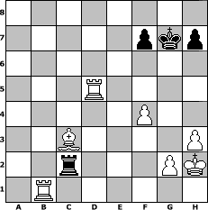 game notation in PGN-format [Event "Ostdeutschland"] [Site "www.myChess.de"] [Date "2008.08.12"] [Round "1"] [White "Seneca"] [Black "neve"] [ECO "D10"] [WhitemyELO "1477"] [BlackmyELO "1466"] [Result "1-0"] [TimeControl "10/2592000"] [WhiteDays "105"] [BlackDays "150"] [MyChessNo "47084"] 1. d4 d5 2. c4 c6 3. e3 Nf6 4. Nc3 e6 5. Nf3 Bd6 6. Be2 Nbd7 7. c5 Bc7 8. O-O e5 9. h3 e4 10. Nh2 Bxh2+ 11. Kxh2 O-O 12. f3 Re8 13. f4 b6 14. b4 a5 15. cxb6 Qxb6 16. bxa5 Qxa5 17. Bd2 Qc7 18. Qc2 Nb6 19. Kh1 c5 20. Nb5 Qe7 21. dxc5 Na4 22. Nd6 Rd8 23. Nxc8 Rdxc8 24. c6 Nc5 25. Bb4 Rxc6 26. Rac1 Rac8 27. Bb5 Rb6 28. a4 Rxb5 29. axb5 Qb7 30. Bxc5 Qxb5 31. Rb1 Qd3 32. Qxd3 exd3 33. Bb4 Rc2 34. Rfd1 Ne4 35. Kh2 d2 36. Bxd2 g5 37. Be1 gxf4 38. exf4 Kg7 39. Rxd5 Nc3 40. Bxc3+ 1-0 position notation in FEN-format 8/5pkp/8/3R4/5P2/2B4P/2r3PK/1R6 - - - 0 40 Captured white pieces: ![]() ![]() ![]() ![]() ![]() ![]() ![]() ![]() ![]() ![]() ![]() ![]() ![]() ![]() ![]() Captured black pieces: ![]() ![]() ![]() ![]() ![]() ![]() ![]() ![]() ![]() ![]() ![]() ![]() ![]() ![]() ![]() Click on a captured piece in order to display the desired move!