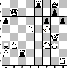 game notation in PGN-format [Event "Pott Schach - Glück Auf die xte."] [Site "www.myChess.de"] [Date "2020.11.05"] [Round "2"] [White "Achimkogge"] [Black "kalle"] [ECO "A45"] [WhitemyELO "1524"] [BlackmyELO "1560"] [Result "1-0"] [TimeControl "10/2592000"] [WhiteDays "119"] [BlackDays "119"] [MyChessNo "119795"] 1. d4 Nf6 2. c3 d5 3. h3 e6 4. Nd2 c5 5. b3 Nc6 6. e3 a6 7. Ba3 b6 8. Bd3 Bd6 9. dxc5 bxc5 10. Ngf3 O-O 11. Ng5 Bb7 12. h4 h6 13. Nh3 Ne5 14. Bc2 d4 15. f4 Neg4 16. exd4 Bxg2 17. Nf2 Ne3 18. Qb1 Bxh1 19. Nxh1 Bxf4 20. Be4 Nxe4 21. Qxe4 Qxh4+ 22. Ke2 Nc2 23. Qxc2 Rfd8 24. Nf3 Qh5 25. Qe4 Bg5 26. Ng3 Qh3 27. Kf2 cxd4 28. cxd4 e5 29. Rh1 Be3+ 30. Qxe3 Qd7 31. Qxe5 Re8 32. Qf5 Qb7 33. Qg4 Rac8 34. Nf5 Rc2+ 35. Kg3 f6 36. d5 1-0 position notation in FEN-format 4r1k1/1q4p1/p4p1p/3P1N2/6Q1/BP3NK1/P1r5/7R - - - 0 36 Captured white pieces: Captured black pieces: Click on a captured piece in order to display the desired move!