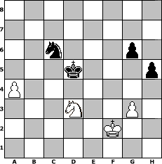 game notation in PGN-format [Event "2. Chess960/1"] [Site "www.myChess.de"] [Date "2008.03.15"] [Round "1"] [White "Alfigator"] [Black "Stabiloboss"] [Variant "Fischerrandom"] [SetUp "1"] [FEN "rqnbbknr/pppppppp/8/8/8/8/PPPPPPPP/RQNBBKNR w KQkq - 0 1"] [WhitemyELO "1501"] [BlackmyELO "1524"] [Result "1/2-1/2"] [TimeControl "10/3456000"] [WhiteDays "212"] [BlackDays "000"] [MyChessNo "43415"] 1. c4 c5 2. Nf3 Nf6 3. b4 cxb4 4. Qxb4 O-O 5. O-O e5 6. d3 d6 7. e4 Ne7 8. Ne2 Nd7 9. Rb1 f5 10. exf5 Nxf5 11. d4 exd4 12. Nexd4 Nxd4 13. Nxd4 Bg6 14. Bc2 Bxc2 15. Nxc2 Bb6 16. Bc3 Qc7 17. Bd4 Rf7 18. Bxb6 Qxb6 19. Qd2 Qc7 20. Ne3 Raf8 21. Rbd1 Nb6 22. Qxd6 Nxc4 23. Qxc7 Rxc7 24. Nd5 Rcf7 25. Rd4 Ne5 26. f3 Nc6 27. Rd2 Rd8 28. Rfd1 Kf8 29. Kf2 Rfd7 30. Ke3 Kf7 31. f4 Ne7 32. Nc3 Nf5+ 33. Ke2 Rxd2+ 34. Rxd2 Rxd2+ 35. Kxd2 Nh4 36. g3 Nf3+ 37. Ke2 Nxh2 38. Nb5 a6 39. Nd6+ Ke6 40. Nxb7 Kd5 41. Nd8 Ng4 42. Kf3 h5 43. f5 Ke5 44. Ne6 g6 45. Nc5 Kxf5 46. Nxa6 Ne5+ 47. Kf2 Ke4 48. a4 Nc6 49. Nc5+ Kd5 50. Nd3 1/2-1/2 position notation in FEN-format 8/8/2n3p1/3k3p/P7/3N2P1/5K2/8 - - - 4 50 Captured white pieces: Captured black pieces: Click on a captured piece in order to display the desired move!