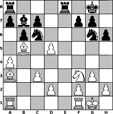 game notation in PGN-format [Event "Februar 2018"] [Site "www.myChess.de"] [Date "2018.02.03"] [Round "1"] [White "Steffi"] [Black "Knight"] [ECO "D20"] [WhitemyELO "1504"] [BlackmyELO "1091"] [Result "1-0"] [TimeControl "10/1728000"] [WhiteDays "26"] [BlackDays "00"] [MyChessNo "111258"] 1. d4 d5 2. c4 dxc4 3. e4 e6 4. Bxc4 Nc6 5. Nf3 h6 6. O-O Bd6 7. Nc3 Bb4 8. a3 Bxc3 9. bxc3 Nge7 10. a4 O-O 11. Ba3 Re8 12. Qb3 Ng6 13. g3 b6 14. Bb5 Bb7 15. d5 exd5 16. Qxd5 Qxd5 17. exd5 1-0 position notation in FEN-format r3r1k1/pbp2pp1/1pn3np/1B1P4/P7/B1P2NP1/3P1P1P/R4RK1 - - - 0 17 Captured white pieces: Captured black pieces: Click on a captured piece in order to display the desired move!