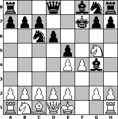 game notation in PGN-format [Event "Freizeitschach"] [Site "www.myChess.de"] [Date "2011.02.28"] [Round "1"] [White "Caligula"] [Black "Henne1"] [ECO "C30"] [WhitemyELO "1362"] [BlackmyELO "1344"] [Result "1-0"] [TimeControl "10/2592000"] [WhiteDays "29"] [BlackDays "29"] [MyChessNo "72362"] 1. e4 e5 2. f4 d6 3. Nf3 Nc6 4. Bc4 Bg4 5. Bxf7+ Kxf7 6. Ng5+ 1-0 position notation in FEN-format r2q1bnr/ppp2kpp/2np4/4p1N1/4PPb1/8/PPPPP1PP/RNBQK2R - KQ - 1 6 Captured white pieces: Captured black pieces: Click on a captured piece in order to display the desired move!