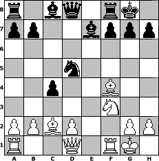 game notation in PGN-format [Event "Modernes Benoni"] [Site "www.myChess.de"] [Date "2010.01.14"] [Round "2"] [White "schoemi"] [Black "Robur"] [ECO "A65"] [WhitemyELO "1546"] [BlackmyELO "1799"] [Result "0-1"] [TimeControl "10/2592000"] [WhiteDays "00"] [BlackDays "47"] [MyChessNo "62398"] 1. d4 Nf6 2. c4 c5 3. d5 e6 4. Nc3 exd5 5. cxd5 d6 6. e4 Nbd7 7. f4 Be7 8. Nf3 O-O 9. e5 Ne8 10. Bd3 Nb6 11. Bc2 Nc7 12. Bb3 c4 13. Bc2 dxe5 14. O-O exf4 15. Bxf4 Ncxd5 16. Nxd5 Nxd5 0-1 position notation in FEN-format r1bq1rk1/pp2bppp/8/3n4/2p2B2/5N2/PPBP2PP/R2Q1RK1 - - - 0 17 Captured white pieces: Captured black pieces: Click on a captured piece in order to display the desired move!