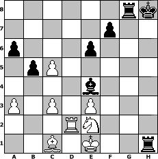 game notation in PGN-format [Event "Wrixum - Open die X"] [Site "www.myChess.de"] [Date "2012.10.06"] [Round "1"] [White "Seneca"] [Black "Knight"] [ECO "A45"] [WhitemyELO "1531"] [BlackmyELO "1032"] [Result "0-1"] [TimeControl "10/2592000"] [WhiteDays "120"] [BlackDays "120"] [MyChessNo "84269"] 1. d4 Nf6 2. e3 d5 3. Bd3 Nc6 4. Nd2 Bg4 5. f3 Bh5 6. a3 e6 7. Ne2 Bd6 8. O-O O-O 9. f4 Re8 10. Nf3 Ne4 11. Ne5 Bxe5 12. dxe5 a6 13. c3 b5 14. Qe1 g5 15. g3 Kh8 16. Nd4 Ne7 17. Bxe4 dxe4 18. fxg5 Bg6 19. g4 c5 20. Ne2 Nc6 21. Qf2 Qxg5 22. Qg3 Nxe5 23. h3 Nf3+ 24. Kg2 h5 25. b4 Rg8 26. Kh1 hxg4 27. hxg4 Rg7 28. Rxf3 exf3 29. Qxf3 Qh4+ 30. Kg2 Rd8 31. Qg3 Be4+ 32. Kf2 Rxg4 33. Qxh4+ Rxh4 34. Ra2 Rg8 35. Ke1 Rd8 36. Rd2 Rg8 37. bxc5 Rh1+ 0-1 position notation in FEN-format 6rk/5p2/p3p3/1pP5/4b3/P1P1P3/3RN3/2B1K2r - - - 1 38 Captured white pieces: Captured black pieces: Click on a captured piece in order to display the desired move!