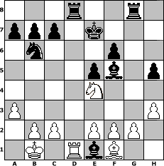 game notation in PGN-format [Event "Pedro Damiano"] [Site "www.myChess.de"] [Date "2016.09.18"] [Round "1"] [White "Knight"] [Black "Helmut48"] [ECO "C40"] [WhitemyELO "1137"] [BlackmyELO "2010"] [Result "0-1"] [TimeControl "10/2592000"] [WhiteDays "90"] [BlackDays "60"] [MyChessNo "104983"] 1. e4 e5 2. Nf3 f6 3. d4 d5 4. dxe5 dxe4 5. Qxd8+ Kxd8 6. Nd4 fxe5 7. Nb3 Nf6 8. Bg5 h6 9. Bxf6+ gxf6 10. N1d2 Bf5 11. O-O-O Nd7 12. h3 h5 13. Bc4 Bh6 14. Kb1 Ke7 15. Rhe1 Nb6 16. Bf1 Rad8 17. a3 Rhg8 18. Nc5 Bxd2 19. Nxe4 Bxe1 0-1 position notation in FEN-format 3r2r1/ppp1k3/1n3p2/4pb1p/4N3/P6P/1PP1PPP1/1K1RbB2 - - - 0 20 Captured white pieces: Captured black pieces: Click on a captured piece in order to display the desired move!