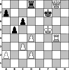 game notation in PGN-format [Event "CM-Turnier-1-2014"] [Site "www.myChess.de"] [Date "2014.01.11"] [Round "1"] [White "Naunhofer"] [Black "balesbenk1"] [ECO "D10"] [WhitemyELO "1673"] [BlackmyELO "1509"] [Result "1-0"] [TimeControl "10/2592000"] [WhiteDays "30"] [BlackDays "30"] [MyChessNo "92285"] 1. d4 d5 2. c4 c6 3. e3 Bf5 4. Nc3 e6 5. Nf3 Bg4 6. Be2 Bxf3 7. Bxf3 Bb4 8. Qb3 Qe7 9. O-O Bxc3 10. bxc3 Nf6 11. Ba3 Qc7 12. cxd5 exd5 13. Rac1 b5 14. e4 dxe4 15. Rfe1 Qf4 16. Bxe4 Nxe4 17. f3 f5 18. Qe6+ Kd8 19. Qe7+ Kc8 20. fxe4 Qc7 21. Qe6+ Qd7 22. exf5 Kb7 23. Qxd7+ Nxd7 24. Re7 Kc7 25. Rxg7 Rag8 26. Re7 Rf8 27. Rf1 Rf6 28. g4 Rg8 29. h3 h5 30. Rf4 hxg4 31. hxg4 Rh8 32. g5 Rg8 33. Rg4 Rxf5 34. g6 Rgf8 35. Rxd7+ Kxd7 36. Bxf8 Rxf8 37. g7 Rg8 38. Kf2 Ke6 39. Ke3 Kf7 40. Ke4 Re8+ 41. Kf5 Rd8 42. g8=Q+ 1-0 position notation in FEN-format 3r2Q1/p4k2/2p5/1p3K2/3P2R1/2P5/P2P4/8 - - - 0 42 Captured white pieces: Captured black pieces: Click on a captured piece in order to display the desired move!