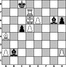 game notation in PGN-format [Event "R"] [Site "www.myChess.de"] [Date "2005.07.20"] [Round "2"] [White "Dragonwolves"] [Black "Basal"] [ECO "C57"] [WhitemyELO "2042"] [BlackmyELO "1900"] [Result "1-0"] [TimeControl "10/2592000"] [WhiteDays "149"] [BlackDays "146"] [MyChessNo "15286"] 1. e4 e5 2. Nf3 Nc6 3. Bc4 Nf6 4. Ng5 d5 5. exd5 Nd4 6. c3 b5 7. Bf1 Nxd5 8. cxd4 Qxg5 9. Bxb5+ Kd8 10. O-O Bb7 11. Qf3 Rb8 12. dxe5 Ne3 13. Qh3 Qxg2+ 14. Qxg2 Nxg2 15. d4 Nh4 16. Bg5+ Be7 17. Bxh4 Bxh4 18. b3 Ke7 19. Nc3 Rhd8 20. Rad1 c6 21. Be2 Kf8 22. f4 Bc8 23. f5 Bg5 24. Rf3 Be7 25. Ne4 Ba3 26. Kf2 h6 27. Bc4 a5 28. Ke3 Ra8 29. Rf2 a4 30. Rg1 axb3 31. Bxb3 Re8 32. Rfg2 Bxf5 33. Rxg7 Ra7 34. Nf6 Rea8 35. Rxf7+ Rxf7 36. Rg8+ Ke7 37. Rxa8 Bc1+ 38. Kf3 Rf8 39. Ng8+ Rxg8 40. Rxg8 Bb2 41. Kf4 Bd3 42. Rg7+ Kd8 43. e6 Ba3 44. Rd7+ Kc8 45. Ke5 Bg6 46. Ba4 c5 47. d5 Bb2+ 48. Kd6 1-0 position notation in FEN-format 2k5/3R4/3KP1bp/2pP4/B7/8/Pb5P/8 - - - 2 48 Captured white pieces: Captured black pieces: Click on a captured piece in order to display the desired move!