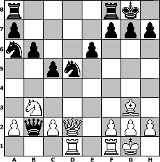 game notation in PGN-format [Event "Turnier gegen Regen :>"] [Site "www.myChess.de"] [Date "2006.09.04"] [Round "2"] [White "Andylein1989"] [Black "Caligula"] [ECO "B01"] [WhitemyELO "1517"] [BlackmyELO "1829"] [Result "0-1"] [TimeControl "10/1728000"] [WhiteDays "34"] [BlackDays "39"] [MyChessNo "28151"] 1. e4 d5 2. exd5 Qxd5 3. Nc3 Qd8 4. Nf3 Nf6 5. d4 e6 6. Bf4 Bb4 7. Qd3 O-O 8. Be2 b6 9. O-O Ba6 10. Qe3 Bxc3 11. Bxa6 Bxd4 12. Nxd4 Nxa6 13. Rad1 Nd5 14. Qd2 c5 15. Nb3 Qf6 16. Bg3 Qxb2 0-1 position notation in FEN-format r4rk1/p4ppp/np2p3/2pn4/8/1N4B1/PqPQ1PPP/3R1RK1 - - - 0 17 Captured white pieces: Captured black pieces: Click on a captured piece in order to display the desired move!