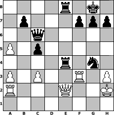 game notation in PGN-format [Event "Carpe Diem 2"] [Site "www.myChess.de"] [Date "2007.08.11"] [Round "2"] [White "MichaelKnopf"] [Black "bruno"] [ECO "A00"] [WhitemyELO "1438"] [BlackmyELO "1495"] [Result "0-1"] [TimeControl "10/1728000"] [WhiteDays "00"] [BlackDays "60"] [MyChessNo "37252"] 1. g3 d5 2. Bg2 Nf6 3. e3 Nc6 4. Ne2 e5 5. O-O Bc5 6. c3 e4 7. b4 Bd6 8. f3 O-O 9. fxe4 dxe4 10. a3 Be6 11. d3 Bg4 12. dxe4 Re8 13. Qe1 Ne5 14. Nf4 c6 15. Nd2 Qb6 16. h3 Be6 17. Nxe6 Rxe6 18. Qe2 a5 19. Bb2 c5 20. Nc4 Qb5 21. bxa5 Nxc4 22. Bc1 Nxe4 23. Bxe4 Rxe4 24. Kg2 Qc6 25. Rf3 Rae8 26. g4 Bf4 27. Ra2 Bxe3 28. Bxe3 Nxe3+ 29. Kh2 Nxg4+ 0-1 position notation in FEN-format 4r1k1/1p3ppp/2q5/P1p5/4r1n1/P1P2R1P/R3Q2K/8 - - - 0 30 Captured white pieces: ![]() ![]() ![]() ![]() ![]() ![]() ![]() ![]() ![]() ![]() ![]() ![]() ![]() ![]() ![]() Captured black pieces: ![]() ![]() ![]() ![]() ![]() ![]() ![]() ![]() ![]() ![]() ![]() ![]() ![]() ![]() ![]() Click on a captured piece in order to display the desired move!