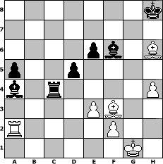 game notation in PGN-format [Event "Weihnachtstunier"] [Site "www.myChess.de"] [Date "2005.12.14"] [Round "1"] [White "otto01"] [Black "Juliette2103"] [ECO "E14"] [WhitemyELO "2132"] [BlackmyELO "1970"] [Result "0-1"] [TimeControl "10/864000"] [WhiteDays "10"] [BlackDays "10"] [MyChessNo "20729"] 1. d4 Nf6 2. c4 e6 3. Nf3 b6 4. e3 Bb7 5. Be2 Bb4+ 6. Nbd2 O-O 7. O-O d5 8. Qc2 Nbd7 9. cxd5 exd5 10. b3 Rc8 11. Qf5 Qe7 12. Bb2 Qe6 13. Qxe6 fxe6 14. Rac1 a6 15. Rfd1 Ng4 16. h3 Ngf6 17. Bd3 c5 18. a3 Ba5 19. Ng5 Rfe8 20. Nf1 h6 21. Nf3 Rf8 22. Bg6 Bc6 23. Ng3 Bb5 24. a4 Bc6 25. h4 Ne4 26. Nh5 Rxf3 27. gxf3 Nd2 28. Rxd2 Bxd2 29. Rc2 Bb4 30. dxc5 bxc5 31. Bxg7 a5 32. Bxh6 Ne5 33. Nf6+ Kh8 34. Bh5 c4 35. bxc4 Bxa4 36. Rc1 Rxc4 37. Ra1 Bc3 38. Ra3 Bb2 39. Ra2 Nxf3+ 40. Bxf3 Bxf6 0-1 position notation in FEN-format 7k/8/4pb1B/p2p4/b1r4P/4PB2/R4P2/6K1 - - - 0 41 Captured white pieces: Captured black pieces: Click on a captured piece in order to display the desired move!
