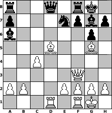 game notation in PGN-format [Event "K"] [Site "www.myChess.de"] [Date "2004.04.28"] [Round "1"] [White "Nightflight"] [Black "MaxPayne"] [ECO "B30"] [WhitemyELO "1605"] [BlackmyELO "1426"] [Result "1-0"] [TimeControl "10/3456000"] [WhiteDays "59"] [BlackDays "74"] [MyChessNo "4211"] 1. e4 c5 2. Nf3 Nc6 3. Bc4 g6 4. d4 cxd4 5. Nxd4 Bg7 6. Nxc6 bxc6 7. O-O d6 8. Qf3 e6 9. Nc3 Ne7 10. Bg5 O-O 11. Rad1 d5 12. exd5 cxd5 13. Nxd5 exd5 14. Bxd5 Ba6 15. c4 1-0 position notation in FEN-format r2q1rk1/p3npbp/b5p1/3B2B1/2P5/5Q2/PP2PPPP/3R1RK1 - - - 0 15 Captured white pieces: ![]() ![]() ![]() ![]() ![]() ![]() ![]() ![]() ![]() ![]() ![]() ![]() ![]() ![]() ![]() Captured black pieces: ![]() ![]() ![]() ![]() ![]() ![]() ![]() ![]() ![]() ![]() ![]() ![]() ![]() ![]() ![]() Click on a captured piece in order to display the desired move!