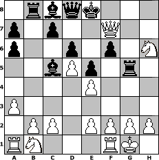 game notation in PGN-format [Event "unter uns Nr. 17"] [Site "www.myChess.de"] [Date "2014.02.13"] [Round "1"] [White "Schefsche"] [Black "MiFie"] [ECO "C21"] [WhitemyELO "1427"] [BlackmyELO "1072"] [Result "1-0"] [TimeControl "10/864000"] [WhiteDays "12"] [BlackDays "19"] [MyChessNo "92919"] 1. e4 e5 2. d4 Nc6 3. d5 Nb4 4. a3 Na6 5. Bxa6 bxa6 6. Nf3 Nf6 7. Bg5 h6 8. Bxf6 gxf6 9. O-O Bc5 10. Nh4 Rg8 11. Nf5 d6 12. Qh5 Rb8 13. Nxh6 Rg5 14. Qxf7# 1-0 position notation in FEN-format 1rbqk3/p1p2Q2/p2p1p1N/2bPp1r1/4P3/P7/1PP1PPPP/RN3RK1 - - - 0 14 Captured white pieces: Captured black pieces: Click on a captured piece in order to display the desired move!