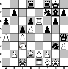 game notation in PGN-format [Event "5er4"] [Site "www.myChess.de"] [Date "2018.08.24"] [Round "1"] [White "MSmeetsRE"] [Black "dshortym"] [ECO "B06"] [WhitemyELO "1726"] [BlackmyELO "1749"] [Result "1/2-1/2"] [TimeControl "10/3456000"] [WhiteDays "106"] [BlackDays "101"] [MyChessNo "112961"] 1. e4 g6 2. d4 Bg7 3. Nf3 c5 4. d5 d6 5. Bd3 Nf6 6. O-O O-O 7. c4 e6 8. Nc3 exd5 9. exd5 Bg4 10. h3 Bxf3 11. Qxf3 Nbd7 12. Qd1 Re8 13. Qc2 a6 14. Bd2 Nh5 15. Rae1 f5 16. Re6 Qh4 17. Re1 Ne5 18. Bf1 Rad8 19. a4 Rf8 20. Qc1 Nf7 21. g3 Nxg3 1/2-1/2 position notation in FEN-format 3r1rk1/1p3nbp/p2pR1p1/2pP1p2/P1P4q/2N3nP/1P1BPP2/2Q1RBK1 - - - 0 22 Captured white pieces: Captured black pieces: Click on a captured piece in order to display the desired move!