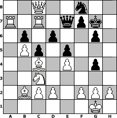 game notation in PGN-format [Event "MySchachOpen"] [Site "www.myChess.de"] [Date "2005.01.22"] [Round "1"] [White "tschulz"] [Black "icke"] [ECO "A00"] [WhitemyELO "1514"] [BlackmyELO "1242"] [Result "1-0"] [TimeControl "10/2592000"] [WhiteDays "74"] [BlackDays "84"] [MyChessNo "9884"] 1. b4 e5 2. b5 b6 3. Bb2 Bd6 4. Nf3 Qe7 5. e4 Nf6 6. Bd3 a6 7. a4 axb5 8. axb5 O-O 9. Rxa8 c5 10. Nh4 Bc7 11. Nf5 Qe6 12. O-O Bb7 13. Ra7 g6 14. Rxb7 Rc8 15. Ne3 d6 16. Bc4 Qd7 17. Nc3 h5 18. Qf3 Qe7 19. Qg3 Kf8 20. Qh3 Nbd7 21. Ra1 Kg7 22. Raa7 Nf8 23. Qxc8 Ng4 24. Nxg4 hxg4 25. Rxc7 1-0 position notation in FEN-format 2Q2n2/R1R1qpk1/1p1p2p1/1Pp1p3/2B1P1p1/2N5/1BPP1PPP/6K1 - - - 0 25 Captured white pieces: Captured black pieces: Click on a captured piece in order to display the desired move!
