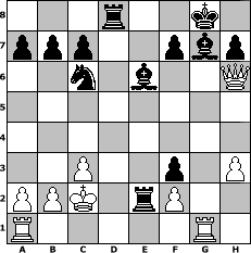 game notation in PGN-format [Event "Faires Schach"] [Site "www.myChess.de"] [Date "2007.03.25"] [Round "1"] [White "paul"] [Black "Sherlock6834"] [ECO "A45"] [WhitemyELO "1329"] [BlackmyELO "1613"] [Result "1/2-1/2"] [TimeControl "10/3456000"] [WhiteDays "076"] [BlackDays "120"] [MyChessNo "33716"] 1. d4 Nf6 2. Nc3 g6 3. Bg5 Bg7 4. Bxf6 exf6 5. Nf3 d5 6. e4 dxe4 7. Nxe4 O-O 8. Bd3 Nc6 9. h3 Nxd4 10. c3 Nc6 11. g4 Re8 12. Qd2 f5 13. gxf5 gxf5 14. Rg1 fxe4 15. Qh6 exf3+ 16. Kd2 Re2+ 17. Kc1 Re1+ 18. Kc2 Qxd3+ 19. Kxd3 Bf5+ 20. Kc4 Be6+ 21. Kd3 Bf5+ 22. Kc4 Be6+ 23. Kd3 Rd8+ 24. Kc2 Re2+ 1/2-1/2 position notation in FEN-format 3r2k1/ppp2pbp/2n1b2Q/8/8/2P2p1P/PPK1rP2/R5R1 - - - 11 25 Captured white pieces: Captured black pieces: Click on a captured piece in order to display the desired move!