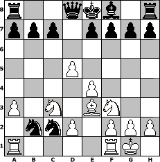 game notation in PGN-format [Event "Marshall Plan"] [Site "www.myChess.de"] [Date "2009.02.02"] [Round "1"] [White "Schmalte"] [Black "Haneken"] [ECO "D06"] [WhitemyELO "1460"] [BlackmyELO "1493"] [Result "0-1"] [TimeControl "10/2592000"] [WhiteDays "58"] [BlackDays "57"] [MyChessNo "52360"] 1. d4 d5 2. c4 Nf6 3. cxd5 Nxd5 4. e4 Nf6 5. Nc3 Nc6 6. Nf3 Bg4 7. Bb5 Bd7 8. d5 Nb4 9. Bxd7+ Nxd7 10. O-O Nc5 11. Be3 Ncd3 12. a3 Nxb2 13. Qc2 Nxc2 0-1 position notation in FEN-format r2qkb1r/ppp1pppp/8/3P4/4P3/P1N1BN2/1nnP1PPP/R4RK1 - kq - 0 14 Captured white pieces: Captured black pieces: Click on a captured piece in order to display the desired move!