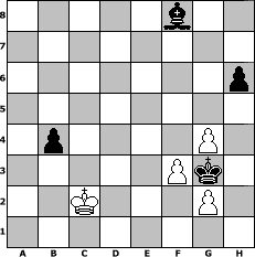 game notation in PGN-format [Event "Mannschaftsturnier der letzen Mohikan3er"] [Site "www.myChess.de"] [Date "2018.06.01"] [Round "1"] [White "wolni55"] [Black "Rotstift10"] [ECO "C23"] [WhitemyELO "1405"] [BlackmyELO "1623"] [Result "0-1"] [TimeControl "10/2592000"] [WhiteDays "122"] [BlackDays "140"] [MyChessNo "112330"] 1. e4 e5 2. Bc4 Nc6 3. Nf3 h6 4. a3 Nf6 5. d3 d5 6. exd5 Nxd5 7. O-O Bg4 8. h3 Bh5 9. Re1 Bxf3 10. Qxf3 Nf6 11. Nc3 Bd6 12. Be3 O-O 13. b4 Nd4 14. Bxd4 exd4 15. Ne4 c6 16. Nxf6+ Qxf6 17. Qxf6 gxf6 18. Re4 f5 19. Re2 Rfe8 20. Ree1 f4 21. Re4 Rxe4 22. dxe4 Be5 23. Rd1 b5 24. Bb3 a5 25. Kf1 axb4 26. axb4 Kg7 27. Ke2 Kg6 28. Kf3 f5 29. exf5+ Kxf5 30. Bf7 Ra4 31. Be8 Rxb4 32. Bxc6 Kg5 33. Ke4 Bg7 34. Rd3 Rb2 35. Rf3 Rxc2 36. Rxf4 Rxc6 37. Rg4+ Kf6 38. Kxd4 Rc4+ 39. Kd3 Rxg4 40. hxg4 Kg5 41. f3 b4 42. Kc2 Kf4 43. Kb3 Bf8 44. Kc2 Kg3 0-1 position notation in FEN-format 5b2/8/7p/8/1p4P1/5Pk1/2K3P1/8 - - - 6 45 Captured white pieces: Captured black pieces: Click on a captured piece in order to display the desired move!