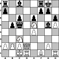 game notation in PGN-format [Event "Dabei ist alles 9"] [Site "www.myChess.de"] [Date "2010.03.22"] [Round "1"] [White "Knight"] [Black "Naunhofer"] [ECO "A45"] [WhitemyELO "1135"] [BlackmyELO "1574"] [Result "0-1"] [TimeControl "10/864000"] [WhiteDays "10"] [BlackDays "10"] [MyChessNo "64214"] 1. d4 Nf6 2. Nc3 d5 3. f3 b6 4. e4 e6 5. Bg5 Be7 6. Bb5+ c6 7. Bd3 dxe4 8. fxe4 Qxd4 9. Nf3 Qc5 10. Bxf6 Bxf6 11. Qd2 Nd7 12. O-O-O O-O 13. h4 b5 14. h5 h6 15. Bf1 Ne5 16. Nxe5 Bg5 0-1 position notation in FEN-format r1b2rk1/p4pp1/2p1p2p/1pq1N1bP/4P3/2N5/PPPQ2P1/2KR1B1R - - - 1 17 Captured white pieces: Captured black pieces: Click on a captured piece in order to display the desired move!