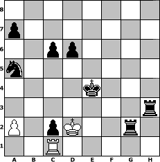 game notation in PGN-format [Event "R"] [Site "www.myChess.de"] [Date "2005.07.20"] [Round "1"] [White "Pocket"] [Black "Baehr008"] [ECO "C54"] [WhitemyELO "1310"] [BlackmyELO "1905"] [Result "0-1"] [TimeControl "10/2592000"] [WhiteDays "137"] [BlackDays "149"] [MyChessNo "15253"] 1. e4 e5 2. Nf3 Nc6 3. Bc4 Bc5 4. c3 Nf6 5. d3 d6 6. Ng5 O-O 7. O-O Bb6 8. Nd2 Ng4 9. Ndf3 Qf6 10. h3 Nxf2 11. Rxf2 Bxf2+ 12. Kxf2 h6 13. Bxf7+ Kh8 14. Bd5 hxg5 15. Kg1 g4 16. hxg4 Bxg4 17. Bg5 Bxf3 18. Qxf3 Qxg5 19. Qh3+ Qh6 20. Qxh6+ gxh6 21. b4 Rf6 22. b5 Na5 23. Rc1 Raf8 24. d4 Rf2 25. g4 R2f4 26. Rc2 Rxg4+ 27. Kh1 c6 28. bxc6 bxc6 29. Be6 Rxe4 30. Rh2 exd4 31. Rxh6+ Kg7 32. Rh5 dxc3 33. Bf5 c2 34. Rg5+ Kf6 35. Rg1 Kxf5 36. Rc1 Rh4+ 37. Kg2 Rg8+ 38. Kf3 Rh3+ 39. Ke2 Ke4 40. Kd2 Rg2+ 0-1 position notation in FEN-format 8/p7/2pp4/n7/4k3/7r/P1pK2r1/2R5 - - - 10 41 Captured white pieces: Captured black pieces: Click on a captured piece in order to display the desired move!