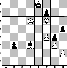game notation in PGN-format [Event "Grünfeld zum Angewöhnen"] [Site "www.myChess.de"] [Date "2019.01.06"] [Round "1"] [White "JohnWayne"] [Black "Cuibono"] [ECO "D86"] [WhitemyELO "1792"] [BlackmyELO "2268"] [Result "1/2-1/2"] [TimeControl "10/2592000"] [WhiteDays "087"] [BlackDays "145"] [MyChessNo "114002"] 1. d4 Nf6 2. c4 g6 3. Nc3 d5 4. cxd5 Nxd5 5. e4 Nxc3 6. bxc3 Bg7 7. Bc4 c5 8. Ne2 Nc6 9. O-O cxd4 10. cxd4 Nxd4 11. Rb1 Nc6 12. Qxd8+ Nxd8 13. Rd1 Bd7 14. Be3 Bc6 15. f3 O-O 16. Nd4 Ba4 17. Rdc1 Rc8 18. Nb5 Nc6 19. Bd5 a5 20. Nc3 Bd4 21. Kf2 Bxc3 22. Rxc3 Nb4 23. Bd2 Bc2 24. Ra1 b6 25. Ke3 Rxc3+ 26. Bxc3 Nxd5+ 27. exd5 Rc8 28. Bb2 b5 29. Rc1 b4 30. Kd2 Bf5 31. Rxc8+ Bxc8 32. Ke3 Bf5 33. Kd4 Bb1 34. a4 Bc2 35. Kc5 Bxa4 36. Kb6 Bc2 37. Kxa5 b3 38. Kb4 g5 39. g3 Bd1 40. f4 g4 41. Kc5 h5 42. Kc6 Bc2 43. Kd7 Kf8 44. d6 exd6 45. Kxd6 Bd3 46. Bc3 Ke8 47. Bf6 1/2-1/2 position notation in FEN-format 4k3/5p2/3K1B2/7p/5Pp1/1p1b2P1/7P/8 - - - 4 47 Captured white pieces: Captured black pieces: Click on a captured piece in order to display the desired move!
