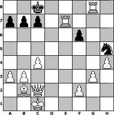 game notation in PGN-format [Event "Energiekrise"] [Site "www.myChess.de"] [Date "2022.10.29"] [Round "1"] [White "Hobbykegler"] [Black "Lohl"] [ECO "A20"] [WhitemyELO "1144"] [BlackmyELO "1388"] [Result "1-0"] [TimeControl "10/1728000"] [WhiteDays "20"] [BlackDays "20"] [MyChessNo "127790"] 1. c4 e5 2. b3 Nf6 3. Bb2 Nc6 4. a3 d5 5. cxd5 Nxd5 6. Nc3 Be7 7. Qc2 Be6 8. O-O-O Qd7 9. Nf3 Bf5 10. e4 Nd4 11. Nxd4 exd4 12. exf5 dxc3 13. dxc3 O-O-O 14. c4 Nf4 15. Rxd7 Rxd7 16. g3 Nh5 17. h4 Re8 18. Bh3 f6 19. Re1 g6 20. fxg6 Red8 21. Bxd7+ Rxd7 22. gxh7 Rd8 23. Rxe7 Rg8 24. hxg8=Q# 1-0 position notation in FEN-format 2k3R1/ppp1R3/5p2/7n/2P4P/PP4P1/1BQ2P2/2K5 - - - 0 24 Captured white pieces: Captured black pieces: Click on a captured piece in order to display the desired move!