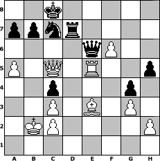 game notation in PGN-format [Event "3. Chess960/3"] [Site "www.myChess.de"] [Date "2009.04.06"] [Round "1"] [White "guinan"] [Black "muetoe"] [Variant "Fischerrandom"] [SetUp "1"] [FEN "rqknnrbb/pppppppp/8/8/8/8/PPPPPPPP/RQKNNRBB w KQkq - 0 1"] [WhitemyELO "1511"] [BlackmyELO "1951"] [Result "1-0"] [TimeControl "10/3456000"] [WhiteDays "137"] [BlackDays "052"] [MyChessNo "54675"] 1. f4 f5 2. g3 c6 3. Nc3 Ne6 4. Nf3 g6 5. d3 d5 6. e3 Qd6 7. Bf2 Bf6 8. a4 g5 9. a5 g4 10. Nd2 N8c7 11. Bg2 h5 12. e4 fxe4 13. dxe4 d4 14. e5 dxc3 15. Ne4 Qd7 16. exf6 Rd8 17. bxc3 Na6 18. fxe7 Qxe7 19. f5 Ng5 20. f6 Qd7 21. Ra4 Nxe4 22. Bxe4 c5 23. Be3 Be6 24. Qb2 Bf7 25. Qa3 Bd5 26. Rd1 Qe6 27. Rxd5 Rxd5 28. Qb3 O-O-O 29. Kb2 Qf7 30. Bxd5 Rxd5 31. Rf4 Rd7 32. Rf5 c4 33. Qb5 Nc7 34. Qc5 Qe6 35. Re5 1-0 position notation in FEN-format 2k5/ppnr4/4qP2/P1Q1R2p/2p3p1/2P1B1P1/1KP4P/8 - - - 5 35 Captured white pieces: ![]() ![]() ![]() ![]() ![]() ![]() ![]() ![]() ![]() ![]() ![]() ![]() ![]() ![]() ![]() Captured black pieces: ![]() ![]() ![]() ![]() ![]() ![]() ![]() ![]() ![]() ![]() ![]() ![]() ![]() ![]() ![]() Click on a captured piece in order to display the desired move!