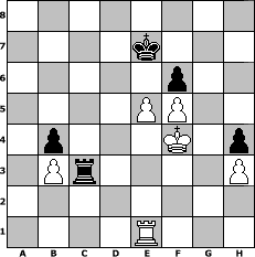 game notation in PGN-format [Event "960-Adventsturnier 2014"] [Site "www.myChess.de"] [Date "2014.11.30"] [Round "1"] [White "Peterlie77 (C)"] [Black "Cuibono"] [Variant "Fischerrandom"] [SetUp "1"] [FEN "nbqnbrkr/pppppppp/8/8/8/8/PPPPPPPP/NBQNBRKR w KQkq - 0 1"] [WhitemyELO "2075"] [BlackmyELO "2013"] [Result "1/2-1/2"] [TimeControl "10/1728000"] [WhiteDays "19"] [BlackDays "19"] [MyChessNo "96921"] 1. c4 c5 2. Nb3 Nb6 3. d4 cxd4 4. Nxd4 Nc6 5. Nxc6 Qxc6 6. Ne3 f6 7. Nf5 Qxc4 8. Qxc4+ Nxc4 9. Nxe7+ Kf7 10. Nf5 d6 11. b3 Na3 12. Be4 Bc6 13. Bxc6 bxc6 14. Bb4 Nb5 15. a4 c5 16. axb5 cxb4 17. Ra1 Rc8 18. Nd4 d5 19. g3 Rc7 20. Nc6 Rb7 21. Ra5 Bc7 22. Rxa7 Rxa7 23. Nxa7 Rb8 24. Kg2 Be5 25. Rd1 Ke6 26. f4 Bc3 27. f5+ Kd6 28. e4 d4 29. Nc6 Rxb5 30. Nxd4 Ra5 31. Kf3 Ra3 32. Ne6+ Kc6 33. Rc1 Kd6 34. Rb1 g5 35. h3 h5 36. Ng7 h4 37. gxh4 gxh4 38. Ne6 Ke7 39. Kg4 Ra2 40. Rd1 Rc2 41. Nc5 Be1 42. Rxe1 Rxc5 43. Kf4 Rc2 44. e5 Rc3 1/2-1/2 position notation in FEN-format 8/4k3/5p2/4PP2/1p3K1p/1Pr4P/8/4R3 - - - 1 45 Captured white pieces: Captured black pieces: Click on a captured piece in order to display the desired move!