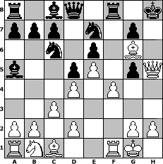 game notation in PGN-format [Event "Hitzeschlacht"] [Site "www.myChess.de"] [Date "2009.08.13"] [Round "1"] [White "Zoidberg"] [Black "Knight"] [ECO "A45"] [WhitemyELO "1823"] [BlackmyELO "1179"] [Result "1-0"] [TimeControl "10/864000"] [WhiteDays "10"] [BlackDays "10"] [MyChessNo "58271"] 1. d4 Nf6 2. f3 e6 3. e4 d5 4. e5 Ng8 5. f4 Nc6 6. Nf3 Bb4+ 7. c3 Ba5 8. Bd3 Nge7 9. O-O O-O 10. Bxh7+ Kh8 11. Ng5 f6 12. Qh5 fxg5 13. Bg6+ 1-0 position notation in FEN-format r1bq1r1k/ppp1n1p1/2n1p1B1/b2pP1pQ/3P1P2/2P5/PP1P2PP/RNB2RK1 - - - 1 13 Captured white pieces: Captured black pieces: Click on a captured piece in order to display the desired move!
