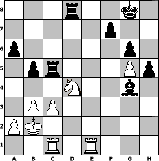 game notation in PGN-format [Event "GWG"] [Site "www.myChess.de"] [Date "2016.01.16"] [Round "1"] [White "Nefumanto"] [Black "Seneca"] [ECO "A45"] [WhitemyELO "1504"] [BlackmyELO "1470"] [Result "0-1"] [TimeControl "10/2592000"] [WhiteDays "113"] [BlackDays "116"] [MyChessNo "102094"] 1. d4 Nf6 2. g4 Nxg4 3. e4 d6 4. Be2 Nf6 5. f3 g6 6. Be3 Bg7 7. Nc3 c6 8. e5 dxe5 9. dxe5 Nd5 10. Nxd5 cxd5 11. Qd2 Bxe5 12. O-O-O e6 13. Bd4 Bxd4 14. Qxd4 O-O 15. h4 Nc6 16. Qf4 e5 17. Qd2 Be6 18. Bf1 d4 19. b3 a6 20. Bd3 b5 21. Ne2 Qe7 22. Be4 Rac8 23. Bxc6 Rxc6 24. Kb2 Rfc8 25. Rc1 Qf6 26. f4 Bg4 27. fxe5 Qxe5 28. Nxd4 h5 29. Rhe1 Qf6 30. c3 Rd8 31. Qg5 Qxg5 32. hxg5 Rc5 0-1 position notation in FEN-format 3r2k1/5p2/p5p1/1pr3Pp/3N2b1/1PP5/PK6/2R1R3 - - - 1 33 Captured white pieces: Captured black pieces: Click on a captured piece in order to display the desired move!