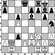 game notation in PGN-format [Event "3. Norderstedter DENK MAL Open 2012"] [Site "www.myChess.de"] [Date "2012.02.08"] [Round "1"] [White "Tomino"] [Black "Schachfedi"] [ECO "D02"] [WhitemyELO "1744"] [BlackmyELO "1797"] [Result "0-1"] [TimeControl "10/2592000"] [WhiteDays "00"] [BlackDays "13"] [MyChessNo "79813"] 1. d4 d5 2. Nf3 Nf6 3. Bf4 Nc6 4. e3 g6 5. h3 Bg7 6. c4 O-O 7. Nc3 Be6 8. c5 Nh5 9. Bh2 b6 10. Bb5 Na5 11. O-O c6 12. Be2 bxc5 13. dxc5 Nc4 14. Rb1 Nxb2 15. Qb3 d4 16. Qxb2 dxc3 0-1 position notation in FEN-format r2q1rk1/p3ppbp/2p1b1p1/2P4n/8/2p1PN1P/PQ1PBPPB/1R3RK1 - - - 0 17 Captured white pieces: ![]() ![]() ![]() ![]() ![]() ![]() ![]() ![]() ![]() ![]() ![]() ![]() ![]() ![]() ![]() Captured black pieces: ![]() ![]() ![]() ![]() ![]() ![]() ![]() ![]() ![]() ![]() ![]() ![]() ![]() ![]() ![]() Click on a captured piece in order to display the desired move!